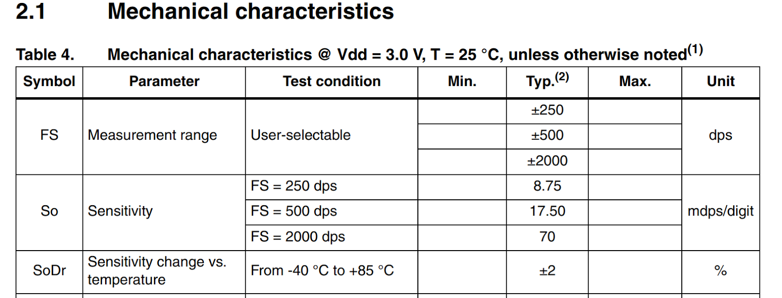 下圖為L3G4200 datasheet p.10 一小部份,其中Sensitivity代表精度,以FS=200dps為例,代表從感測器輸出的數字1代表8.75mdps,如果輸出為兩千時,當前角速度為2000*8.75/1000000dps = 0.0175 dps。